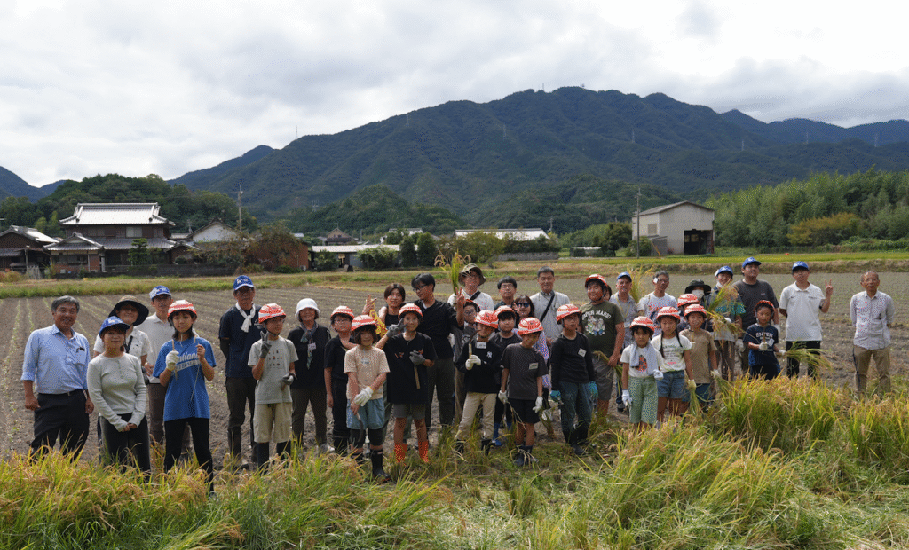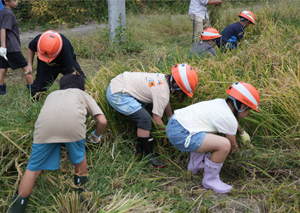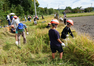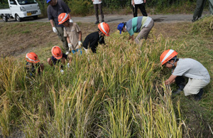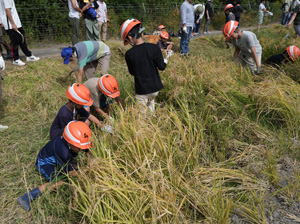 6月に植えた稲をみんなで刈る。暑いけどヘルメット被ってがんばりました。