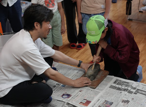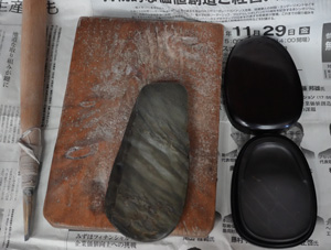 東京 浅草からいらした青柳先生に直に硯の作成を習いました。版画でつかうような巨大な彫刻刀で石を削っていきました。特殊な金属で先ができているようです。