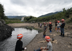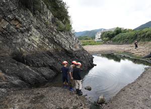 石と川の復習のあと石を取りに湊川にいきました。ひさしぶりに水がなくて河川の侵食状況がよくわかりました。川が曲がっているところは要注意!
