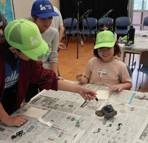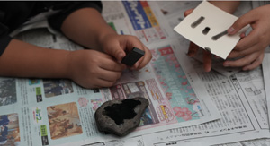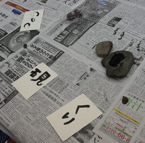 最後は、青柳先生と硯作成を体感。自分の取ってきた硯で墨をすって、指で字を書きました。